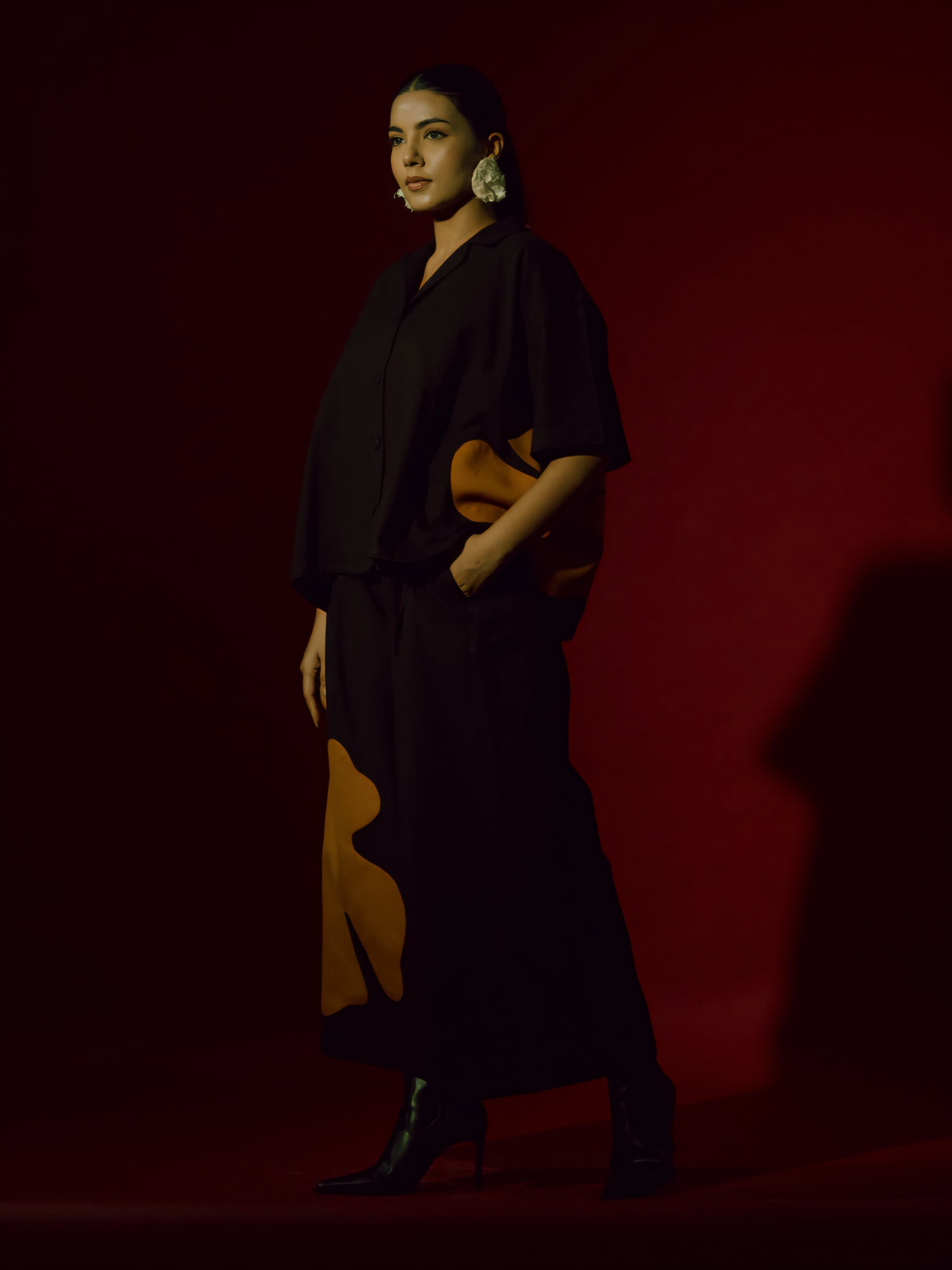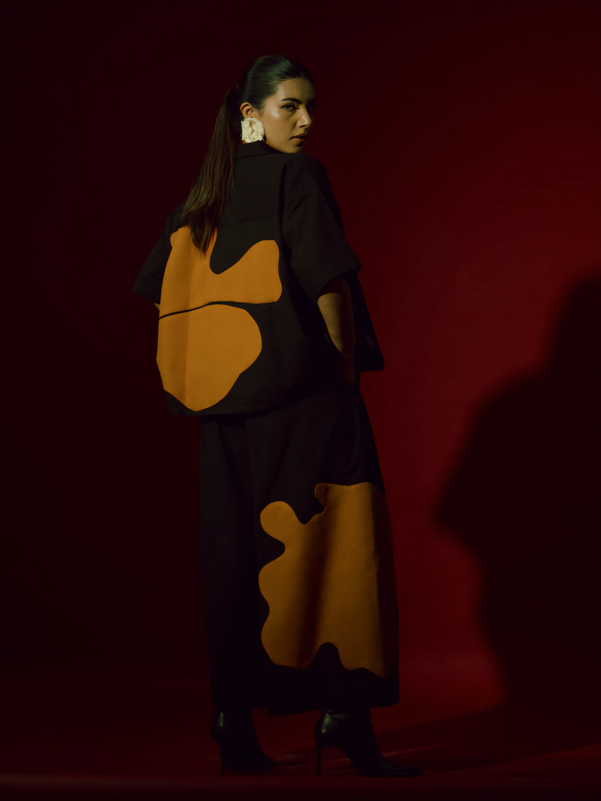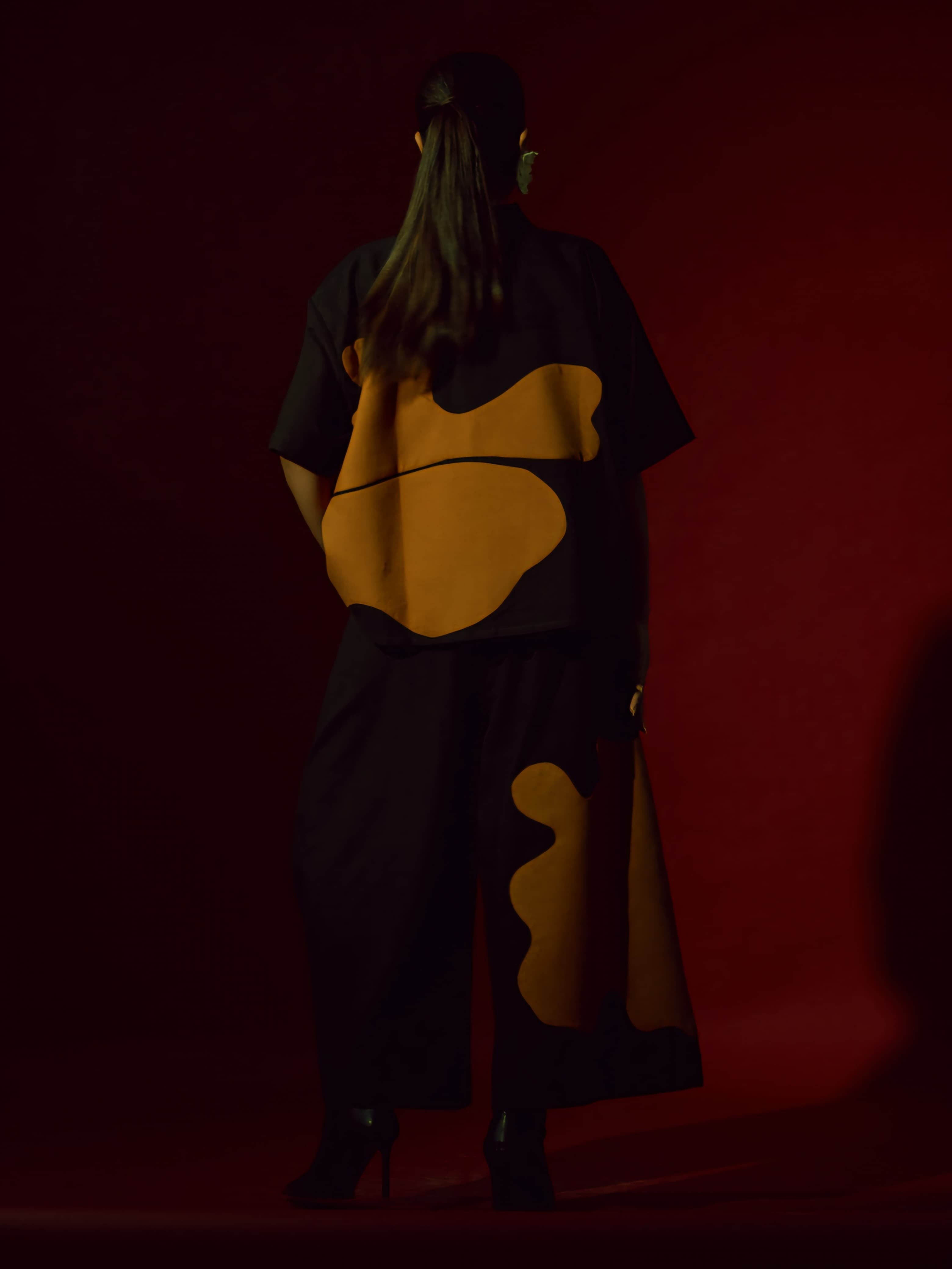 A two-piece set pairing the Cumin Shirt and the Cumin Pants. An oversized kimono-style shirt with contrast appliqué and contrast facing featuring a V-neckline.