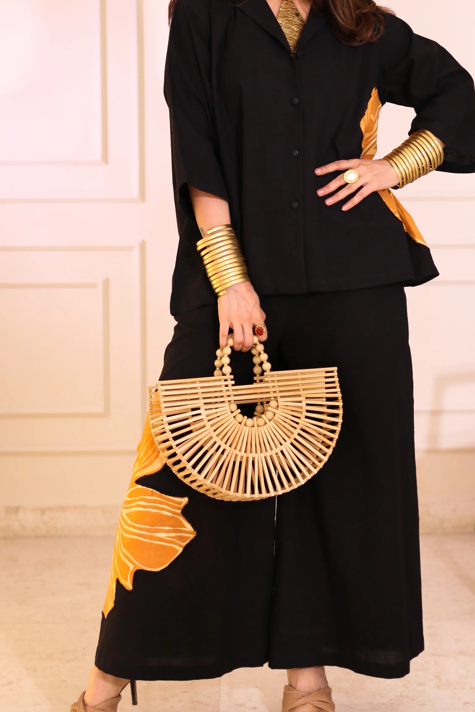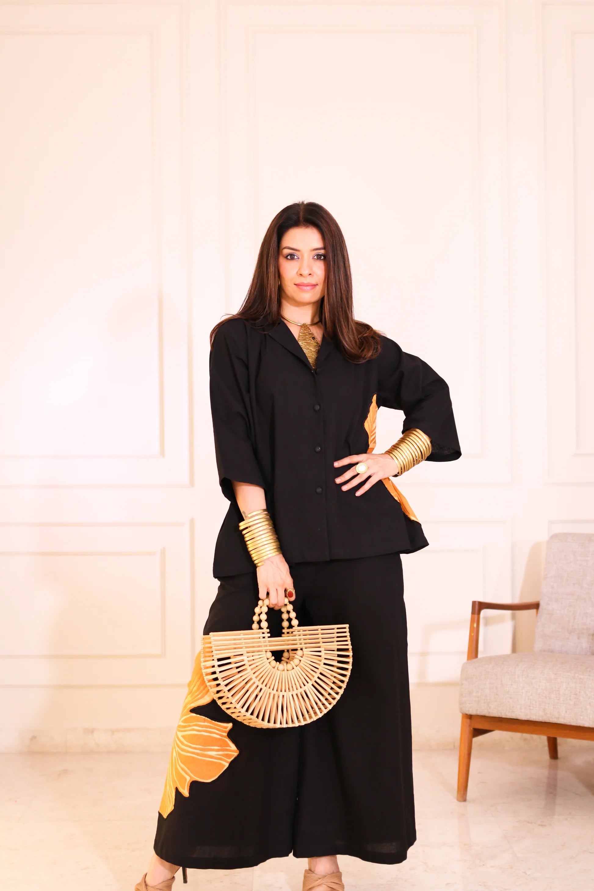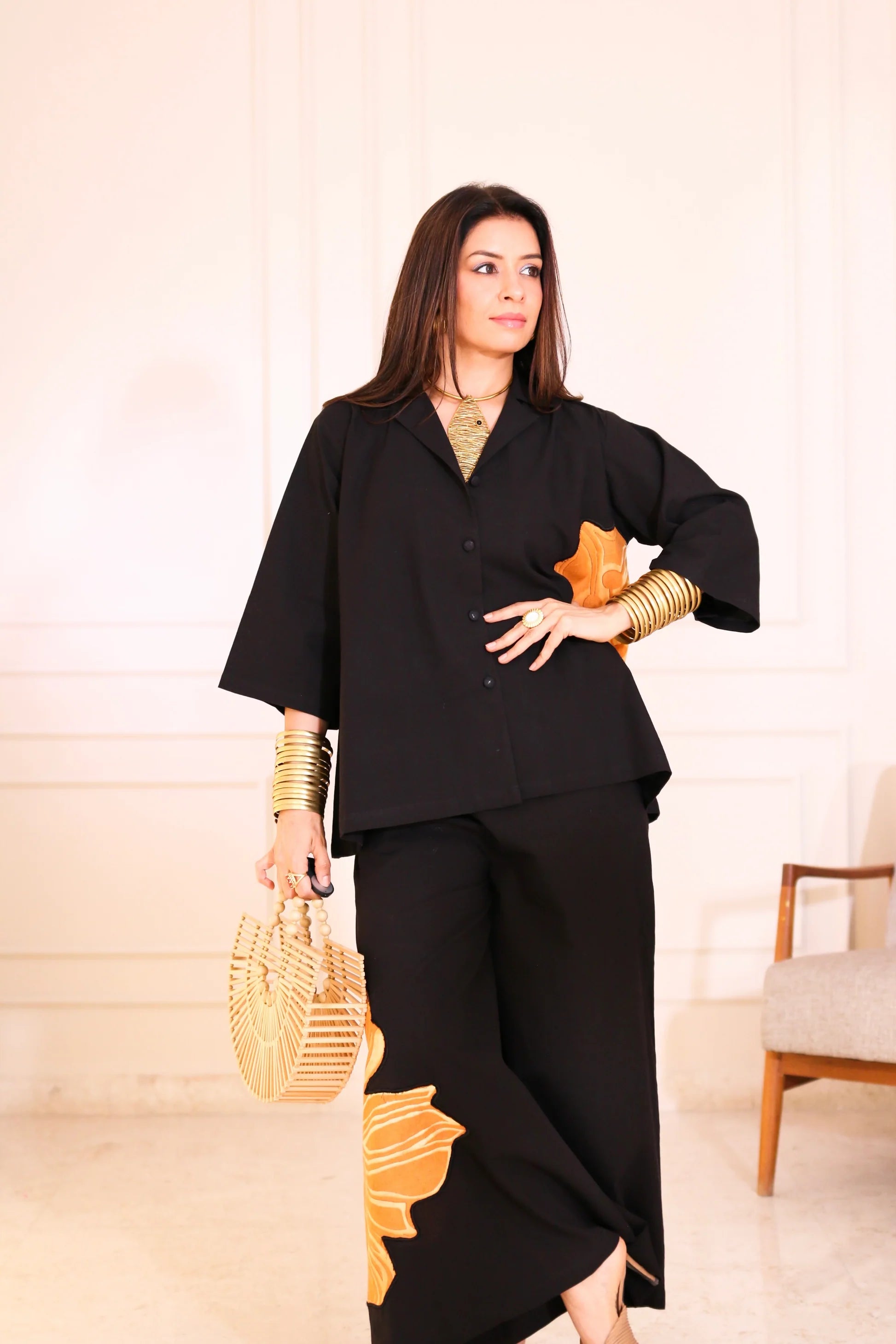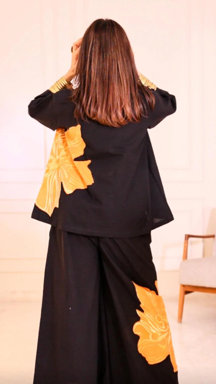Elegant and versatile, this black cord set features stunning floral patchwork that adds a vibrant, feminine touch—perfect for making a bold yet graceful statement.