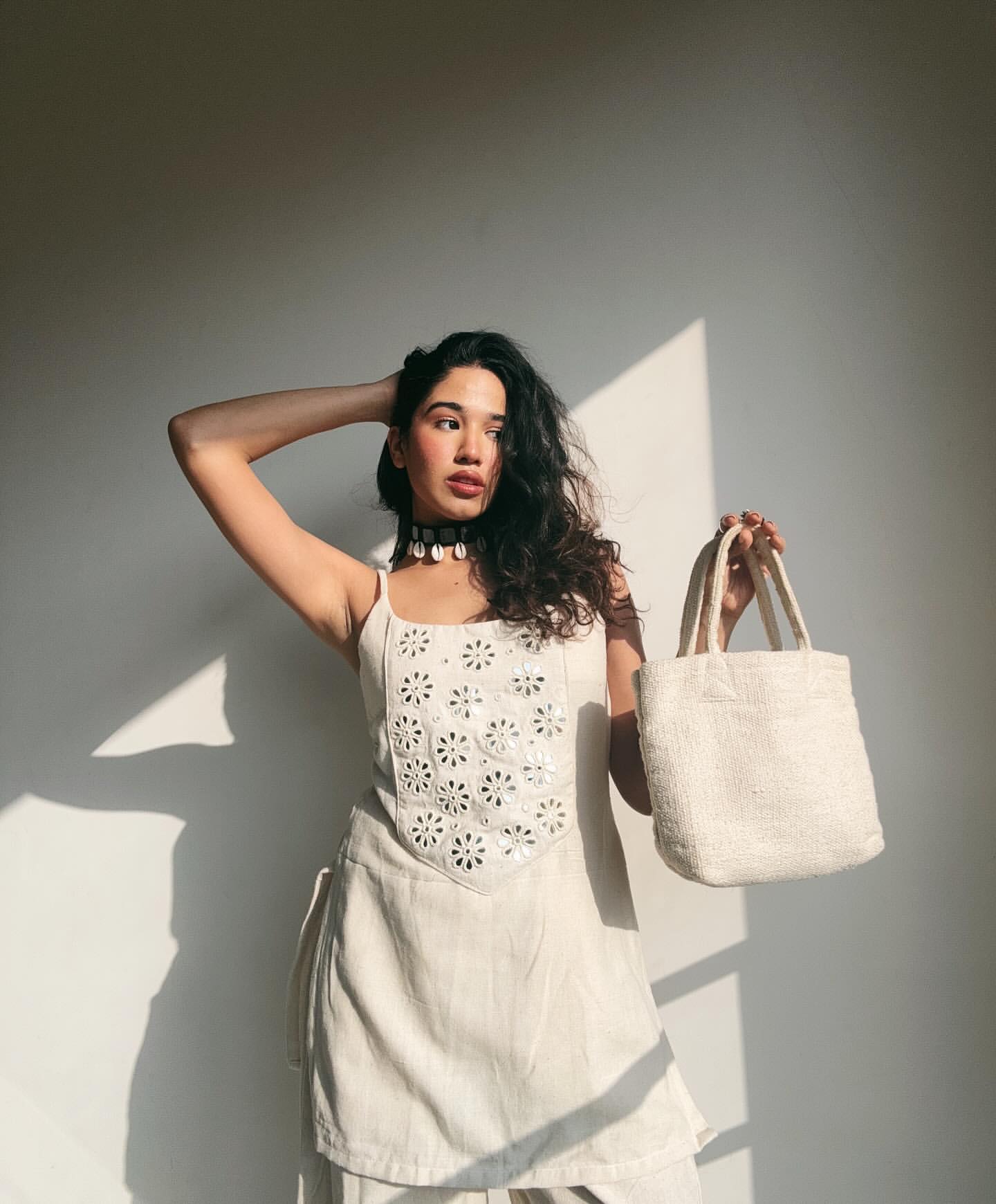 Casual styling and precious details come together in this stretch cotton ribbed jersey top. The cropped silhouette pairs perfectly with the casual feel of ribbing, while the deep V-neck is enriched with an embroidery of fine rows of precious monili, completing the look of the top with a very feminine sparkling note.